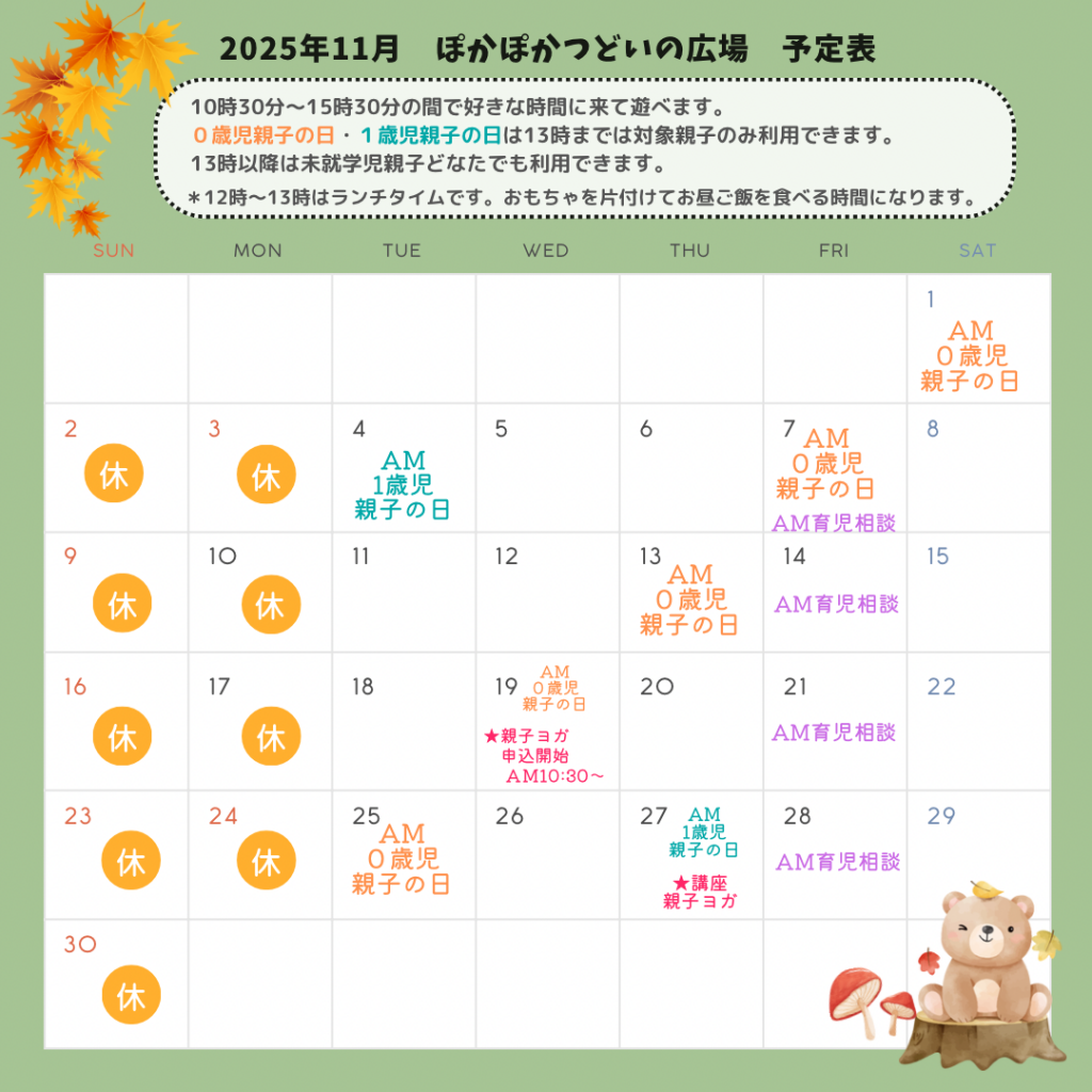 | 利用日時 | 毎週火曜日~土曜日(日曜日・月曜日・祝日・年末年始は休み) 10:30~15:30 ただし、12:00~13:00はランチタイム(食事可能、食べ物持ち込み可能)ですので、おもちゃは片付けます。 *0歳児親子の日、1歳児親子の日があります。 上記のぽかぽかつどいの広場日程表にてご確認ください。またはお問い合わせください。 10:30~13:00 その対象に親子のみ利用可(12:00~13:00はランチタイム) 13:00~15:30 未就学児親子利用可 |